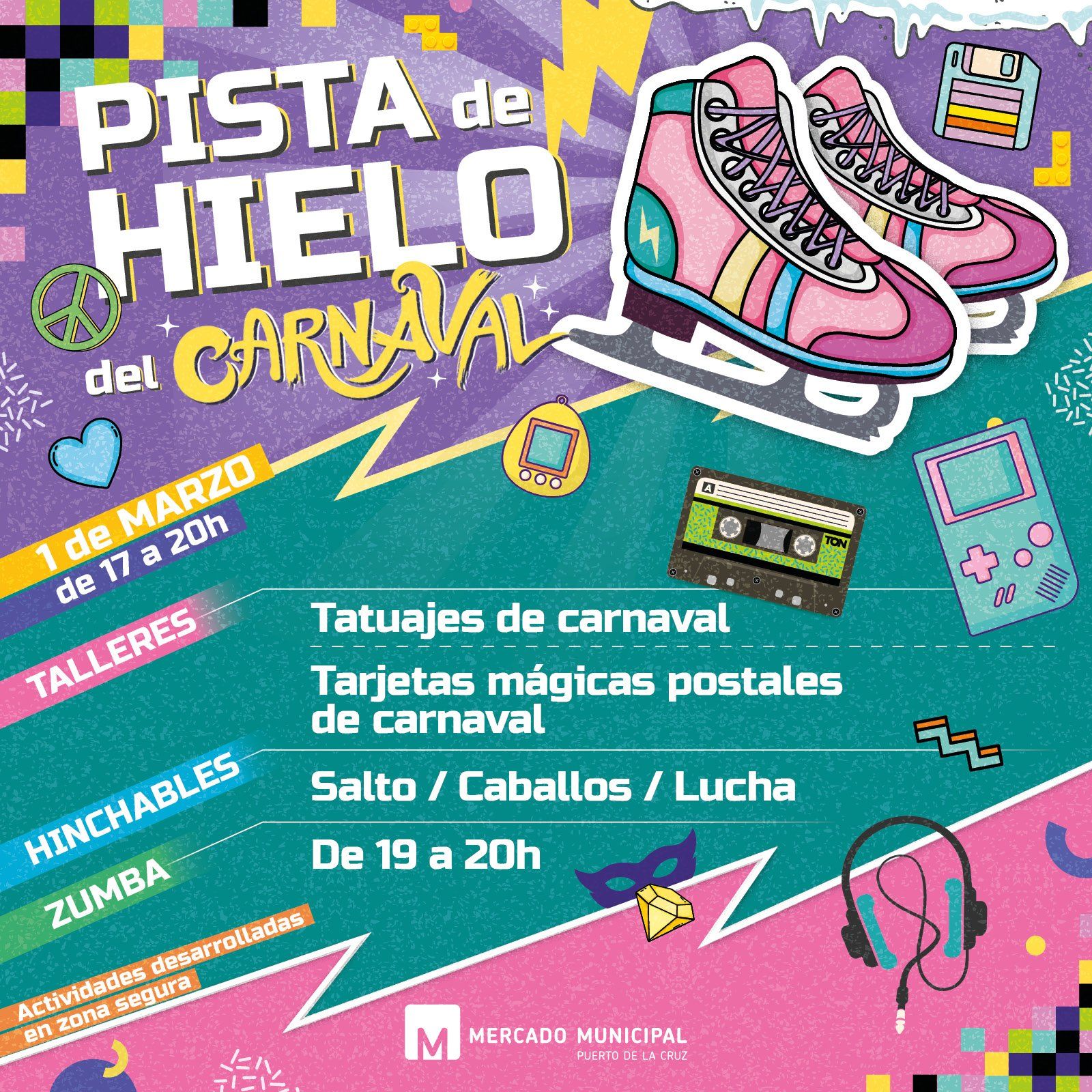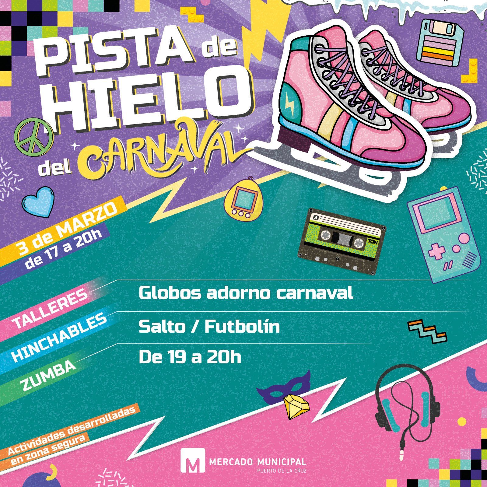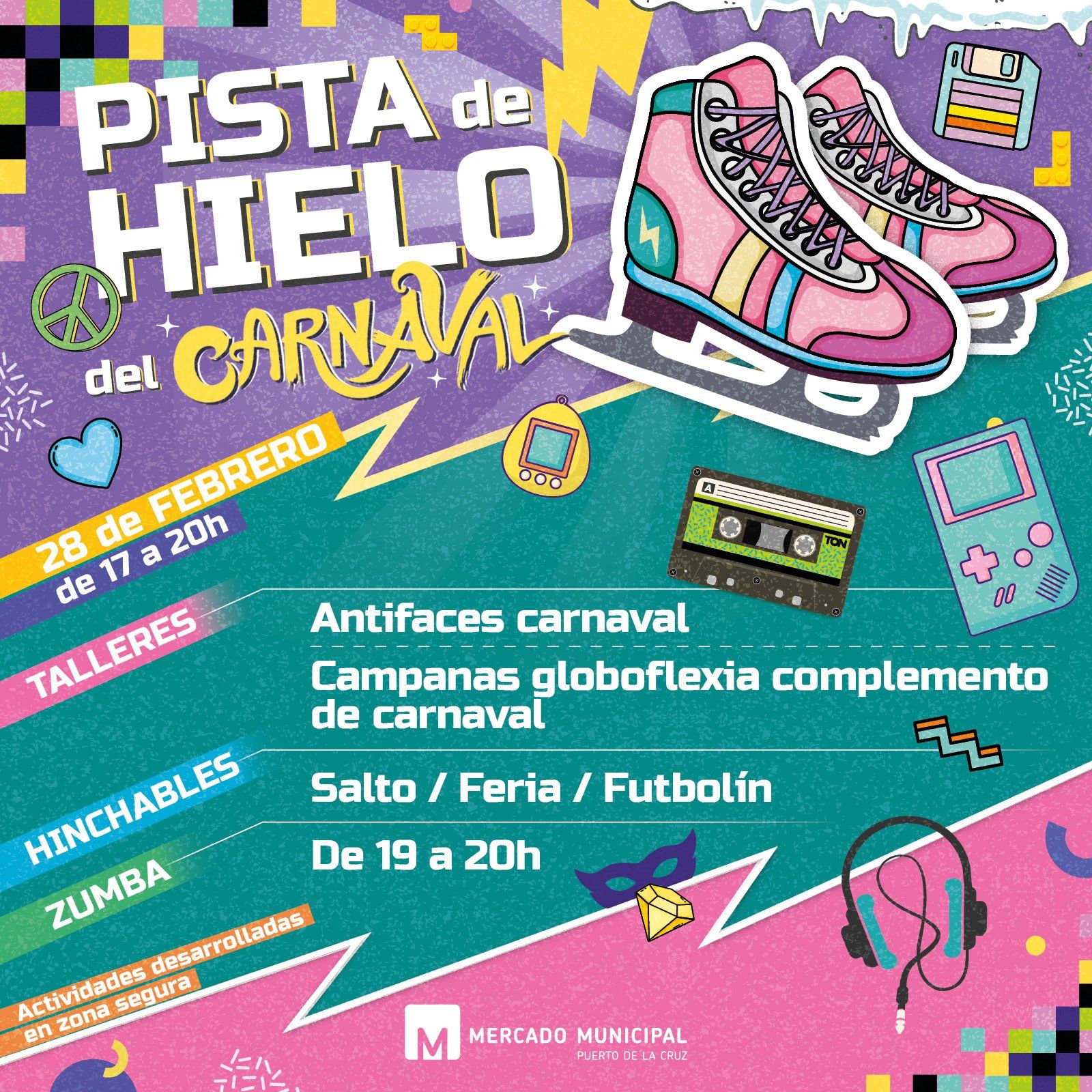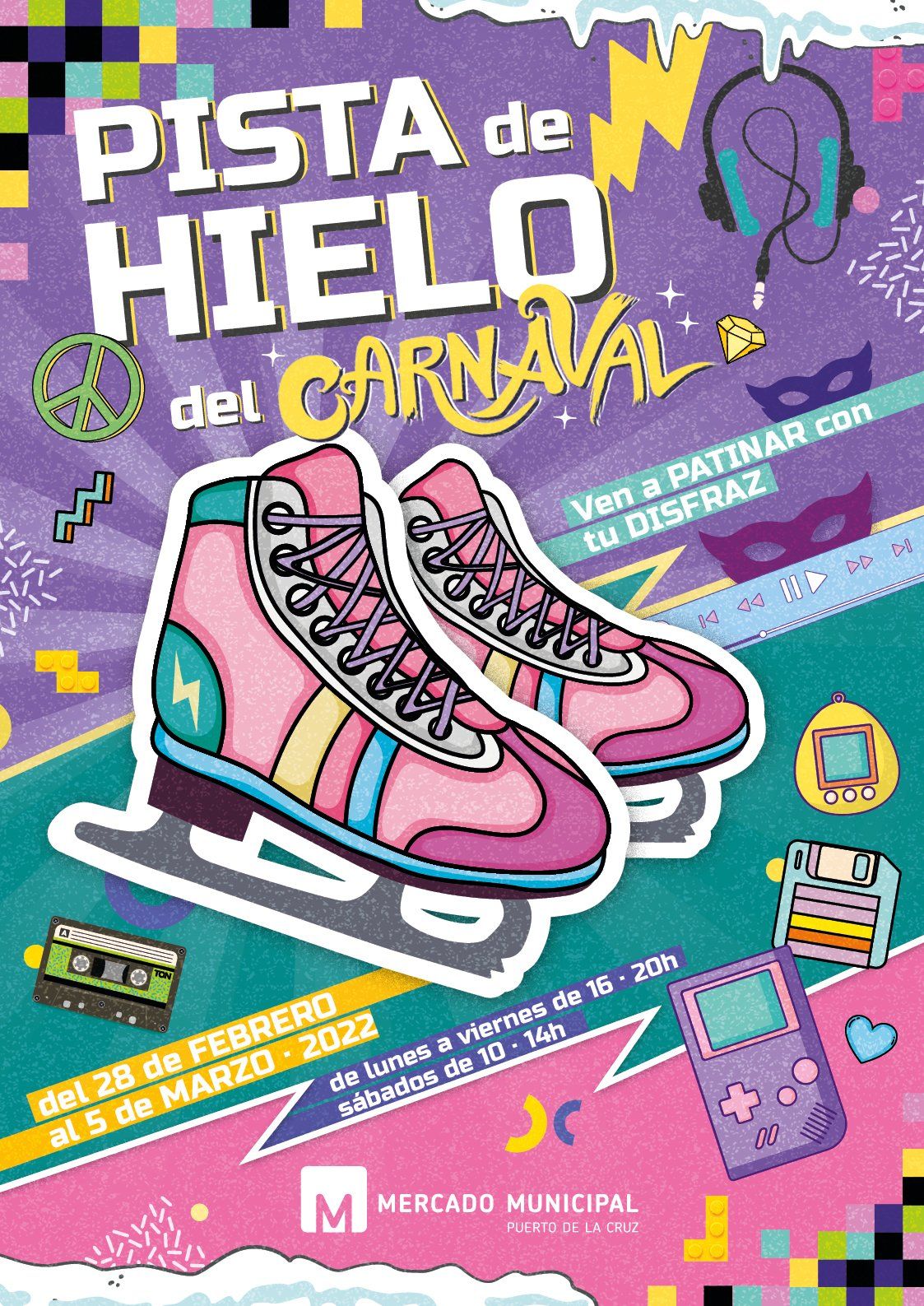 Por supuesto, lo mejor para el final, la estrella del show... ¡Una gran pista de hielo! Ven y disfruta del ambiente noventero mientras bailas y patinas en nuestra pista desde el 28 de febrero hasta el 5 de Marzo, que permanecerá abierta de Lunes a Viernes de 16:00 a 20:00 h. y Sábados de 10:00 a 14:00 h.